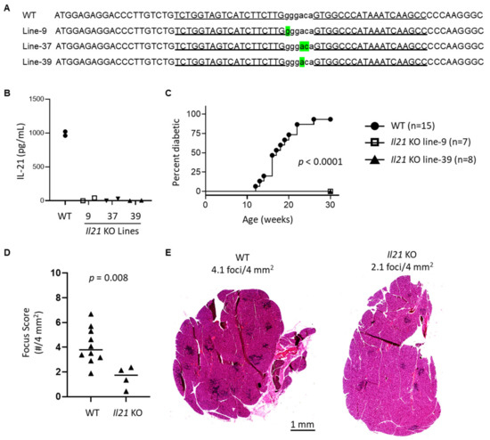 Given the previous association of IL-21 with SD [22] and our findings of Il21 as a highly DE gene in WT lacrimal glands in older but not younger NOD mice, we wondered if IL-21 was required for lacrimal gland inflammation in NOD mice. To evaluate this, we created new lines of Il21 KO NOD mice using zinc-finger nuclease (ZFN)-mediated mutagenesis directly in NOD embryos. One or two base pair deletions in the Il21 gene were detected in three different lines (Figure 3A). IL-21 protein was not detected in stimulated splenocytes from any of these three lines (Figure 3B). Two of the lines were monitored for diabetes development and proved to be completely protected from the development of diabetes as expected based on prior studies of NOD mice deficient in IL-21 signaling [23,24,25] (Figure 3C). To evaluate the role of IL-21 in the development of lacrimal gland inflammation, we quantified inflammation in colony-matched, 10-week-old WT and Il21 KO NOD mice and found a significant decrease in inflammation in mice lacking IL-21 (Figure 3D–E). Together these data demonstrate that IL-21 plays a pathogenic role in development of lacrimal gland inflammation in NOD mice.