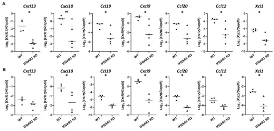 While IL-21 is clearly a disease-relevant cytokine downstream of IFNAR1-signaling, the lack of a significant difference in Il21 expression in young NOD mice (Figure 2D) suggested that additional type I IFN-dependent signals were likely involved in early lacrimal gland inflammation. The two most highly overrepresented pathways identified in the RNA sequencing studies were cytokine-cytokine receptor interaction pathway and viral protein interactions with cytokine and cytokine receptor pathway (Table 3, Table 4 and Table 5, Supplemental Tables S3–S5). Given the role of chemokines in directing immune cell migration to, infiltration of, and localization within target tissues in the context of an immune response, we considered the differential expression of chemokines further through qPCR analyses. Specifically, we considered chemokines identified by RNA sequencing as being upregulated 12–16-fold (Cxcl13, Cxcl10, Ccl19, Cxcl9, Ccl20) or 6–10-fold (Ccl12, Xcl1) in WT lacrimal glands (Table 4 and Table 5). Similar to our prior findings of Cxcl9 and Ccl19 upregulation in 14–16-week-old WT compared to IFNAR1 KO lacrimal glands [19], qPCR of lacrimal glands from 14-week-old NOD mice demonstrated increased expression of these chemokines compared to IFNAR1 KO lacrimal glands (Figure 4A). In addition, at 14-weeks, Cxcl13, Ccl20, Ccl12, and Xcl1 were each expressed at significantly higher levels in lacrimal glands from WT NOD mice compared to those of IFNAR1 KO NOD mice (Figure 4A). To determine which chemokines were upregulated at an earlier time in disease development, we evaluated gene expression in 8-week-old NOD mice and found that even at this early time point Cxcl10, Cxcl9, Ccl12, Ccl20, Ccl19, and Xcl1 were each expressed at significantly higher levels in WT lacrimal glands, while Cxcl13 was not (Figure 4B).