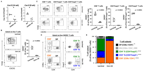 Two of the chemokines identified as being upregulated in WT lacrimal glands at an early stage in lacrimal gland inflammation (i.e., CXCL9 and CXCL10) share a receptor–CXCR3. Cxcr3 was significantly DE with over seven-fold increase in WT compared to IFNAR1 KO lacrimal glands in the RNA sequencing studies (Table 5, Supplemental Table S1). By qPCR, we found Cxcr3 upregulated in lacrimal glands of 14-week-old WT compared to IFNAR1 KO NOD mice and in lacrimal glands of 8-week-old mice (Figure 5A). Flow cytometric analyses of T cells isolated from lacrimal glands or lacrimal gland-draining cervical lymph nodes of nine-week-old WT NOD mice demonstrated enrichment of CXCR3-expressing T cells within lacrimal glands (Figure 5B). These differences were evident to varying degrees for each CD8+ T cells, CD4+ effector T cells, and CD4+ regulatory T cells (Figure 5C). When comparing the distribution of these T cell populations among the CXCR3+ T cells in glands or lymph nodes, we found that while CD8+ T cells were the dominant T cells expressing CXCR3 in the lymph nodes, the CXCR3-expressing gland-infiltrating T cells were dominated by Foxp3+CD4+ regulatory T cells (Figure 5D,E).