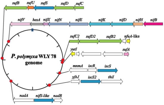 Genomic location of the Paenibacillus polymyxa WLY78 nif gene cluster and the putative genes involved in Fe–S cluster biogenesis. The schematic diagram representation shows the relative location, size, and orientation of the genes, and relevant flanking genes.