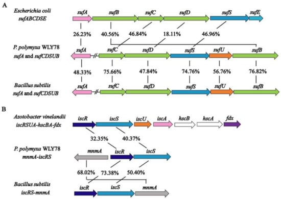 Comparison of the P. polymyxa WLY78 suf and isc cluster with other bacteria. (A) Comparison of the P. polymyxa sufCDSUB operon and the sufA gene with Escherichia coli and Bacillus subtilis suf operons and sufA genes. (B) Comparison of the P. polymyxa iscRS operon with the Azotobacter vinelandii and B. subtilis isc operons. For gene products with similar sequences, their amino acid identity (%) is indicated.