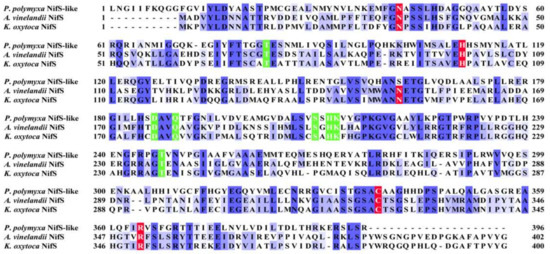 Comparison of amino acid sequences of the NifS-like protein from P. polymyxa WLY78 and NifS from A. vinelandii and K. oxytoca. Amino acid sequences were aligned using the Clustal Omega program (https://www.ebi.ac.uk/Tools/msa/clustalo/, accessed on 25 March 2021). Conserved residues involved in pyridoxal-phosphate (PLP) binding and activity are indicated by a green background. Invariable cysteine and other residues involved in substrate binding are indicated by a red background.