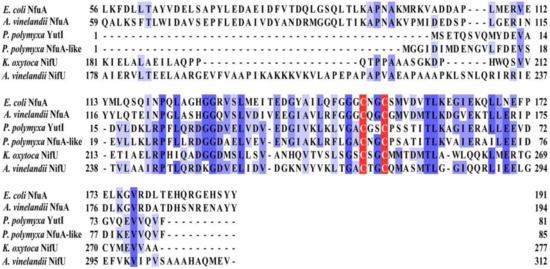 Comparison of NifU-like proteins (YutI and NfuA-like) from P. polymyxa, NifU from A. vinelandii, NifU from K. oxytoca, and NfuA from E. coli. Protein sequences were aligned using the Clustal Omega program (https://www.ebi.ac.uk/Tools/msa/clustalo/, accessed on 25 March 2021). Conserved CXXC motifs are highlighted with a red background.