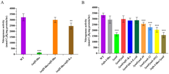 Sequence analysis indicates the presence of two genes (nfuA-like and yutI genes), encoding for 85 and 81 amino acids, respectively, that share similarity with the C-terminus of the Fe–S scaffold protein NifU and the Fe–S carrier NfuA in A. vinelandii (Figure 4). The current analysis using the BLAST alignment showed that NfuA-like and YutI proteins encoded by nfuA-like and yutI genes have 61.73% identity. In this study, the in-frame deletion mutants ΔnfuA-like and ΔyutI were constructed. The ΔnfuA-like mutant showed almost similar nitrogenase activity as wild-type P. polymyxa WLY78, suggesting that the nfuA-like gene is not involved in nitrogen fixation (Figure 5B).