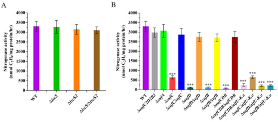 2.5. The sufCDSUB Operon Is Required for Nitrogenase, but the sufB2C2D2 Operon and sufA Gene Is Not