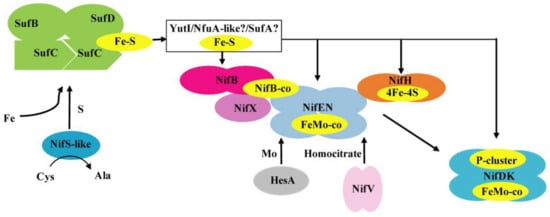 In P. polymyxa WLY78, the sufC, sufD, and sufB genes of the suf (sufCDSUB) operon, the nifS-like gene, and the yutI gene are required for the Fe–S cluster biosynthesis of nitrogenase. The cysteine desulfurase NifS-like catalyzes the production of sulfur, and SufCDB proteins provide a molecular scaffold for the assembly of the Fe–S cluster. YutI is an Fe–S carrier that is involved in nitrogen fixation.