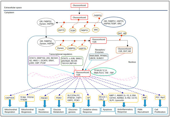 Canonical glucocorticoid receptor signaling underpinning the mechanism of action of corticosteroids. Corticosteroid (CSTs) exert their downstream effects on host cells by activating glucocorticoid receptor (GR), which modulate the transcription of several target genes. The binding of CST with GR leads to conformational changes in GR; the GR-complex translocate to the nucleus, where GR binds to GR-response elements, including positive (blue arrows) and negative (red lines) transcriptional regulators, receptors and enzymes. The downstream effects, including mitochondrial functions, metabolism, stress response, and anti-inflammatory effects of CST, are mediated through differential regulation of various effector molecules (dotted lines with arrow).