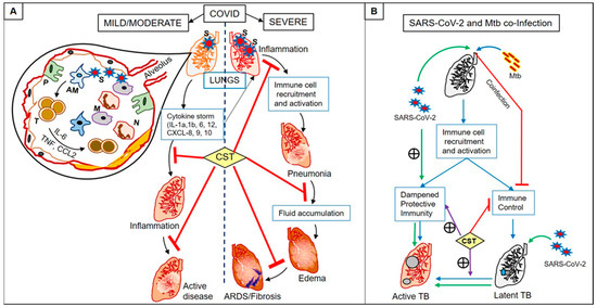 Summary of pathological events associated with Severe Acute Respiratory Syndrome Coronavirus-2 (SARS-CoV-2) and Mycobacterium tuberculosis (Mtb) co-infection and the effect of corticosteroid therapy. (A). SARS-CoV-2 enters through the pulmonary route, reaches the alveoli, and interacts with host immune cells, including alveolar macrophages (AM) and pneumocytes (P). Infection of AM produces cytokines/chemokines that recruit and activate other immune cells such as T cells (T), monocytes (M), neutrophils (N) from the blood to the infection site. Activated T cells also produce inflammatory cytokines, leading to a “cytokine storm”. In COVID-19 cases with mild and moderate symptoms, the cytokine storm-mediated inflammation is either controlled and the patient recovers; or the infection progresses to active disease with severe symptoms. The lungs of COVID-19 cases with severe symptoms showed elevated immune cell recruitment and activation, leading to pneumonia. As the disease progresses, the accumulation of fluid in the lungs results in inflammatory pulmonary edema, leading to acute respiratory distress syndrome (ARDS) and pulmonary fibrosis. Corticosteroid (CST) treatment blocks inflammation caused by the cytokine storm and prevents the formation of pneumonia, edema, ARDS, and fibrosis in severe COVID-19 cases. (B). Infection of lungs by Mycobacterium tuberculosis (Mtb) causes either symptomatic cavitary progressive tuberculosis (active TB) in individuals with dampened protective immunity or non-progressive LTBI (blue lines) in those with strong immune control. LTBI cases can reactivate to symptomatic TB upon immune-suppressing host conditions. The SARS-CoV-2 infection would happen either in the context of active TB or LTBI (no symptoms). In the SARS-CoV-2 and Mtb co-infected cases (green lines), the host protective immunity is further dampened, leading to exacerbated disease among active TB cases. Besides, SARS-CoV-2 infection of LTBI cases may result in reactivation to active TB (green lines). Corticosteroid (CST) therapy can potentially cause immune-suppression (red line), which augments the dampened protective immunity (purple line), accelerating disease pathology in active TB cases (green line) and reactivates LTBI into symptomatic TB (purple line). Mtb-mediated disease pathologies can be further worsened by SARS-CoV-2 infection; thus, both TB and SARS-CoV-2 promote the disease caused by each of these pathogens.