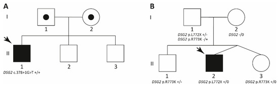 An NGS exome sequencing analysis using Nextseq 550 (Illumina, San Diego, CA, USA) was done for the index patient in Family B (II-2, Figure 2B). Libraries were prepared using the Truseq DNA Library Preparation Kit (Illumina, San Diego, CA, USA) and the xGen Exome Research Panel (IDT, Integrated DNA Technologies, Coralville, IA, USA). Variants with MAF < 0.001 in 188 cardiomyopathy-associated genes (Appendix B) were analyzed. The verification of DSG2–p.L772X and DSG2–Ex2_Ex14del was done by Sanger sequencing on an Applied Biosystems 3500 DNA Analyzer (Thermo Fisher Scientific, Waltham, MA, USA). All stages of sequencing were carried out according to the manufacturers’ protocols. CytoScan HD arrays (Affimetrix, Santa Clara, CA, USA) were used for I‑1, I-2, and II-1 (Family B) and were performed by Atlas Biolabs (Berlin, Germany). Analysis of SNP arrays was done using Chromosome Analysis Suite V4.2.0.80 (Thermo Fisher Scientific, Waltham, USA).