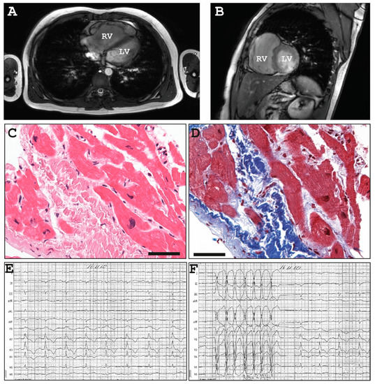 Clinical data of II-I, Family A. (A–B) Cardiac magnetic resonance imaging (MRI) revealed a dilated right ventricle with reduced global function and segmental bulging. Hematoxylin and eosin (C) and trichrome staining (D) of a right-ventricular biopsy revealed subendocardial fibrosis and degeneration of cardiomyocytes. Scale bars represent 50 µm. (E–F) Right axis deviation, at the age of 12 years still incomplete, later complete right bundle branch block, inverted T-waves in the right precordial leads and non-sustained ventricular tachycardia were present in the 12-lead electrocardiogram (ECG).