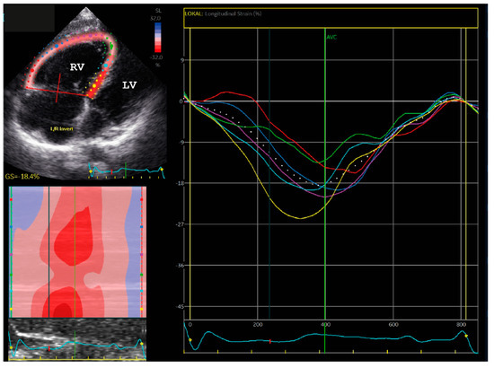 Speckle tracking echocardiography (STE) demonstrated dyssynchrony of the septal and right ventricular free-wall segments (see also Video S1, Supplementary Data).