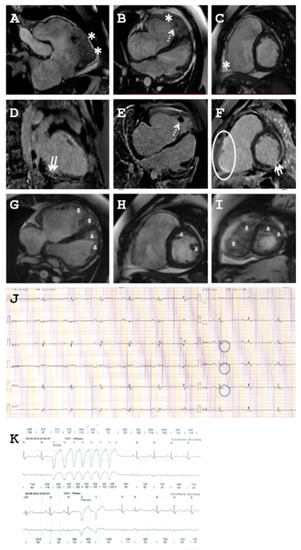 Clinical data of Family B. (A–I) Cardiac magnetic resonance imaging (MRI) of index patient (II-2, Family B). Asterisk indicates thinning and aneurysmal protrusion of right ventricular wall (A–C). Arrows indicate ischemic changes in left ventricle (D,F). Dotted arrows indicate thrombosis in the right ventricle (B,E). Ellipse shows fibrosis of the right ventricle (F). Triangle demonstrates LV non-compaction (G–I). Rhombus demonstrates RV non-compaction (G,I). (J) Epsilon waves were present in the 12-lead ECG. (K) Tachycardia was present in the Holter monitoring-ECG.
