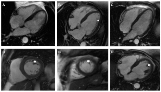 Cardiac magnetic resonance imaging (MRI) of the I-1 (A), I-2 (B,D–F), and II -1 (C) of Family B. Asterisk indicates non-compaction layer.