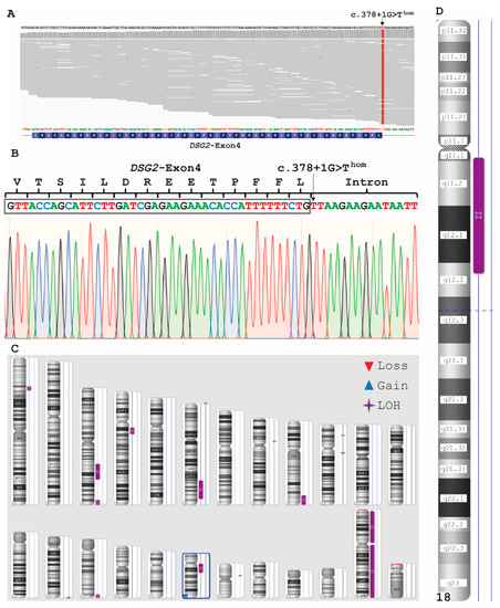 Genetic analysis of II-1 (Family A). (A) Integrated genome view of exon 4 in DSG2 of patient II-1. (B) Electropherogram of exon 4 in DSG2 (II-1). The mutation DSG2–c.378+1G>T is affecting the donor splice site and is found in a homozygous status. (C) Karyoview of II-1. LOH = loss of heterozygosity. (D) Detailed ideogram of human chromosome 18 revealing a 15.6 Mb loss of heterozygosity (LOH).