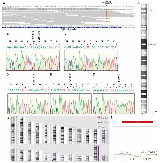In family B with Russian origin, only the index patient (II-2, Figure 1B) received an ACM diagnosis. Comparable to family A, we started the genetic analysis with an NGS approach for the index patient II-2, revealing eight rare variants with a MAF < 0.001 (Table 2). Interestingly, comparable to family A we found exclusively reads for a nonsense mutation DSG2-p.L772X, indicating homo- or hemizygosity (Figure 7A). This finding was verified by Sanger sequencing. In addition, we genotyped the unaffected parents (I-1 and I-2) and the two siblings (II-1 and II-3). Of note, beside the heterozygous DSG2-p.L772X mutation, the father carried a further heterozygous SNP (DSG2-p.R773K, MAF = 0.2604, https://gnomad.broadinstitute.org/variant/18-29122799-G-A?dataset=gnomad_r2_1 (accessed on 20 January 2021), Figure 7B). Surprisingly, the mother (I-2) was wild type for both variants excluding parental consanguinity (Figure 7C). The older brother II‑1 of the index patient did not carry the nonsense variant, but carried the SNP DSG2-p.R773K in a heterozygous status (Figure 7D). The dizygotic twin sister II‑3 presented the same SNP in a homozygous status (Figure 7F). Since all children carried either DSG2-p.L772X or -p.R773K, it can be concluded that the father (I-1) carried both DSG2 variants in a compound heterozygous status. To investigate the genetic reason for homozygosity of DSG2-p.L772X in II-2 and of DSG2-p.R773K in II-3, we performed a SNP microarray for the index patient II-2 and his parents (Supplementary Figure S1). These analyses revealed a large additional deletion mutation affecting nearly the complete DSG2 gene (Figure 7G–I) for the index patient (II-2) and his mother (I-2). In summary, we identified a hemizygous nonsense variant (DSG2-p.L772X) for the index patient and suggest therefore a recessive inheritance in Family B (Figure 1B) caused by paternal inheritance of DSG2-p.L772X and maternal inheritance of DSG2_Ex2-14del.