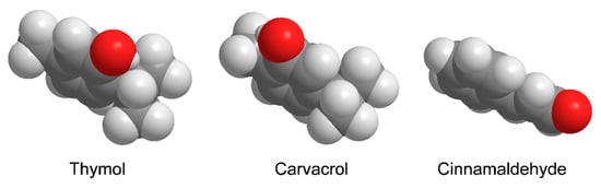 - Didry, N.; Dubreuil, L.; Pinkas, M. Activity of thymol, carvacrol, cinnamaldehyde and eugenol on oral bacteria. Pharm. Acta Helv. 1994, 69, 25–28. [Google Scholar] [CrossRef]