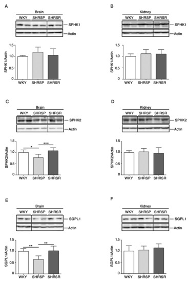 Figure 2. Expression of S1P metabolizing enzymes is defective in brain tissues from SHRSP. Representative cropped immunoblottings and densitometric analysis of SPHK1 (sphingosine kinase 1) (A,B), SPHK2 (sphingosine kinase 2) (C,D) and SGPL1 (S1P-Lyase) (E,F) in brain and kidney tissues from WKY, SHRSP and SHRSR. In each immunoblotting, all samples were run on the same gel. Non-adjacent samples are separated by a black line. Data are represented as mean ± SD, n = 6/7 for each group of rats. * p   < 0.05; ** p < 0.01; *** p   < 0.001 (one-way ANOVA, Tukey post-test). The raw date for generating the figure are reported in the Supplementary Material Table S1.
