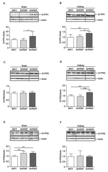 Figure 3. Expression of S1P receptors is aberrant in both brain and kidney tissues from SHRSP and SHRSR. Representative immunoblottings and densitometric analysis of S1PR1 (S1P receptor 1) (A,B), S1PR2 (S1P receptor 2) (C,D) and S1PR3 (S1P receptor 3) (E,F) in brain and kidney tissues from WKY, SHRSP and SHRSR. In each immunoblotting, all samples were run on the same gel. Non-adjacent samples are separated by a black line. Data are represented as mean ± SD, n = 6/8 for each group of rats. * p   <   0.05; ** p < 0.01; *** p   <   0.001 (one-way ANOVA, Tukey post-test). The raw date used for generating the figure are reported in the Supplementary Materials Table S2.