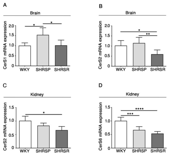 Figure 4. Gene expression of ceramide synthetizing enzymes is defective in brain and kidney tissues from SHRSP and SHRSR. qPCR analysis of CerS1 (ceramide synthase 1) (A) and CerS2 (ceramide synthase 2) (B) in brain tissue from WKY, SHRSP and SHRSR. qPCR analysis of CerS2 (C) and CerS6 (ceramide synthase 6) (D) in kidney tissue from WKY, SHRSP and SHRSR. Data are represented as mean ± SD, n = 5/6 for each group of rats. * p <   0.05; ** p < 0.01; *** p   < 0.001; **** p <   0.0001 (one-way ANOVA, Tukey post-test). The raw date used for generating the figure are reported in the Supplementary Material Table S3.