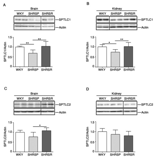 Figure 5. Expression of rate-limiting enzyme of de novo sphingolipid biosynthesis is defective in brain and kidney tissues from SHRSP and SHRSR. Representative immunoblottings and densitometric analysis of SPTLC1 (serine palmitoyltransferase long chain base subunit 1) (A,B) and SPTLC2 (serine palmitoyltransferase long chain base subunit 2) (C,D) in brain and kidney tissues from WKY, SHRSP and SHRSR. In each immunoblotting, all samples were run on the same gel. Non-adjacent samples are separated by a black line. Data are represented as mean ± SD, n = 6/7 for each group of rats. * p < 0.05; ** p < 0.01 (one-way ANOVA, Tukey post-test). The raw date used for generating the figure are reported in the Supplementary Materials Table S4.