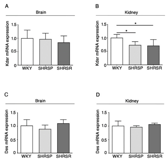 Figure 6. Expression of Kdsr mRNA is reduced in kidney tissues from SHRSP and SHRSR. qPCR analysis of Kdsr (3-keto-dihydrosphingosine reductase) (A,B) and Des (ceramide desaturase) (C,D) in brain and kidney tissues from WKY, SHRSP and SHRSR. Data are represented as mean ± SD, n = 5/6 for each group of rats. * p < 0.05 (one-way ANOVA, Tukey post-test). The raw date used for generating the figure are reported in the Supplementary Materials Table S5.