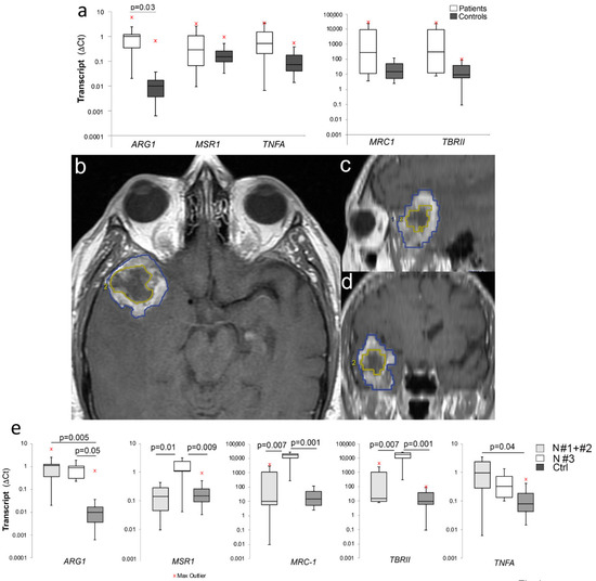 Figure 1. M2 gene expression profile in peripheral blood of glioblastoma (GBM) patients (a) Box plots of ARG1, MSR1, MRC1, TBR II, and tumor necrosis factor-α (TNFA) transcript levels in RNA extracted by 11 patients and 9 healthy donors’ peripheral blood mononuclear cells (PBMCs). (bd) T1 TSE post-gadolinium images, axial section (b), and sagittal (c) and coronal (d) plane reconstructions: Region of interest (ROI) 1 (blue) indicate the tumor volume, ROI 2 (yellow) the necrosis volume. (e) MSR1, MRC1, TBR II, and TNFA transcript levels according to the necrosis score (N#3 = 4, N#1 + #2 = 8). Graphs were generated using Microsoft Excel.app 16.43.