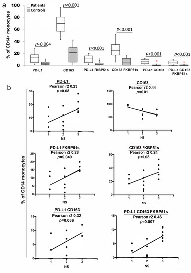 Figure 2. PD-L1+ peripheral monocytes in GBM patients (a) Box plots of counts of the whole PD-L1+ and CD163+ monocytes and their subsets co-expressing FKBP51s+ or a combination of PD-L1 and CD163 in the study population (14 patients and 14 healthy donors). Counts were performed on CD14-gated PBMCs. The graph was generated using Microsoft Excel.app 16.43. (b) Linear regression with Pearson correlation of M2 monocyte subsets and necrosis score. Graphs were generated using Prism GraphPad 7.0a Macintosh. NS = necrosis score.