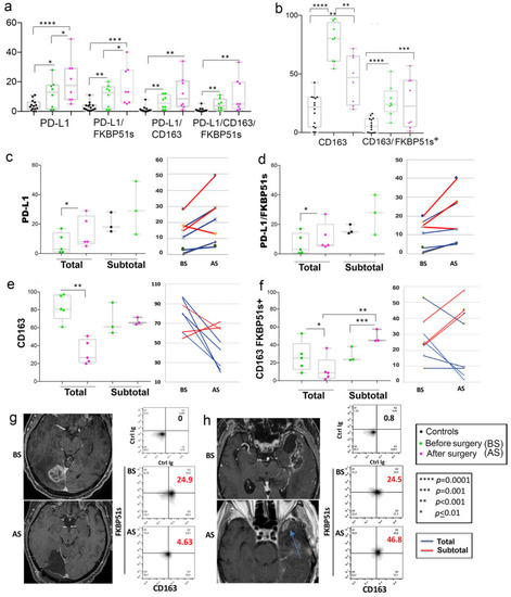 Figure 3. Effect of tumor removal on M2 immunophenotype (a) Boxplots of pre-operative and post-operative counts of whole PD-L1+ monocytes and their subgroups. (b) Boxplots of pre-operative and post-operative counts of whole CD163+ monocytes or CD163/FKBP51s+ monocytes. (cf) Boxplots of pre-operative and post-operative counts are shown according to total or subtotal tumor removal: whole PD-L1+ monocytes (c), PD-L1/FKBP51s+ monocytes (d), whole 163+ monocytes (e), CD163/FKBP51s monocytes (f). In any panel, the line graph on the right shows the post-operative changes for each patient. Boxplots were generated using Prism GraphPad 7.0a Macintosh; line graphs were generated using Microsoft Excel.app 16.43. (g) T1 W post-gadolinium images of a patient with total resection and (f) a case of subtotal resection (h). Blue arrow indicates the residual part of the tumor. Before-surgery images (BS) and after-surgery images (AS) are shown along with flow cytometry histograms of CD163/FKBP51s+ monocytes (highlighted in red).