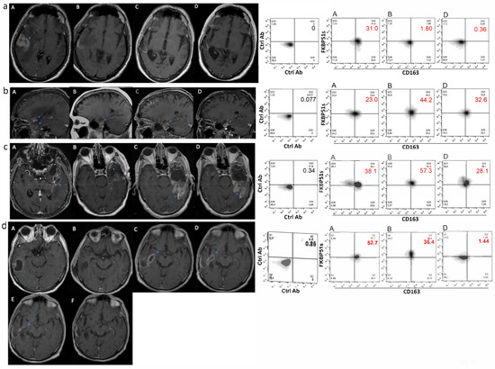Figure 4. MRI and CD163/FKBP51s+ monocytes on follow-up. Axial T1 images after contrast medium administration: the glioblastoma before surgery in A, the immediate post-operative image in B, post-radio-chemotherapy in C, and post-adjuvant temozolomide (TMZ) in D. On the right, correspondent flow cytometry of CD163/FKBP51s+ monocytes. (a) The glioblastoma before surgery in the right temporal lobe. The immediate post-operative image shows a macroscopically complete exeresis of the tumor. Images C and D show no disease progression. (b) The glioblastoma before surgery in the right temporal lobe. The immediate post-operative image shows a residual tumor. Images C and D show the stability of the residual tumor. (c) The glioblastoma before surgery in the left temporal lobe. The immediate post-operative image shows a residual tumor. Image C highlights a disease progression, which tends to be stable in subsequent D control. (d) The glioblastoma before surgery in the right temporal lobe. The post-operative image shows a macroscopically complete exeresis of the tumor. C and D images show a thick impregnation area along the deepest portion of the surgical cave suspected for disease progression, which tended to regress in subsequent controls (E, F).