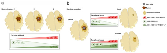 Figure 5. Visual summary of the main findings of the article. The cartoon shows that FKBP51s marked CD163+ monocytes (green) or PD-L1+ monocytes (red) that responded in a different way to tumor necrosis score (a) or extent of surgical resection (b). (a) PD-L1+FKBP51s+ monocytes increased with the tumor necrosis score. By contrast, CD163+ monocytes decreased with the necrosis score. This trend was reversed, albeit not significantly, in CD163+FKBP51s+ monocytes. (b) The PD-L1+FKBP51s+ subset had a postoperative increasing tendency, both in the cases of total and subtotal tumor removal. The CD163+FKBP51s+ monocytes decreased upon total removal, while they increased after subtotal removal.