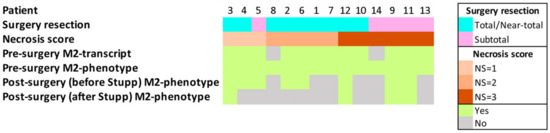 Monocytes are highly plastic cells that undergo specific differentiation depending on the local tissue environment. They respond to environmental cues within tissues to differentiate into distinct functional phenotypes. We have previously shown that the splicing of FKBP51 is an event that concurs with the acquisition of M2 features, namely, IL-10, STAT-3, and PD-L1 upregulation [21]. Chen and coauthors demonstrated that the transformation of bone-marrow-derived macrophages in TAMs occurs very early during GBM development due to direct interaction with neoplastic cells in the perivascular niche [11]. Their tumor-promoting effects operate from the initial stage of GBM development [11]. IL-10 produced by glioma cells has also been found to play a role as an initial chemotactic agent to recruit monocytes and a driver of immunosuppressive loops between cancer cells and macrophages within the tumor microenvironment [32,33]. IL-10 cooperates with other not yet identified tumor-derived soluble factors to promote TAM development [18]. Although the dynamics of the cross-talk between glioma cells and TAMs remain scarcely known, it is widely accepted that TAMs are a heterogeneous population that contributes significantly to the creation and maintenance of immunosuppression and tumor progression [14]. There is still a lack of knowledge regarding the differential composition and functions of TAMs [14]. However, also in contexts different from cancer, it is now clear that the M2 macrophages encompass a functionally diverse group of macrophages [34,35]. In our study, ARG1 levels were increased in all patients, as previously described [36]; differently, MSR1, MRC1, and TBRII expressions were remarkable only in patients with high necrosis score. These results support the concept of M2 macrophage heterogeneity. Consistently, using quadruple staining, we identified several monocyte subsets. Some phenotypes that were co-expressing PD-L1, FKBP51s, and/or CD163 appeared to be correlated with the necrosis score, suggesting that changes in the tumor microenvironment of GBM could influence their development. We found that CD163 is the most represented M2 marker of GBM peripheral monocytes. Unexpectedly, it was inversely correlated with the necrosis score. Gabrusiewicz et al. found that glioblastoma-derived exosomes induce PD-L1 expression on human monocytes [37]. It could be hypothesized that, in circumstances such as necrosis, stimuli from the microenvironment preferentially upregulate subsets of PD-L1+ monocytes. CD163 monocytes appeared to respond to the surgical removal of the tumor. In subtotal resected patients, most of the peripheral CD163 monocytes that were FKBP51s− in the preoperative stage had turned into FKBP51s+, suggesting that the persisting tumor stimulated the development of this monocyte subset. Figure 5 illustrates how PD-L1 and CD163 monocyte subsets change according to necrosis score and surgical resection. After Stupp therapy, while totally resected patients showed CD163/FKBP51s+ monocytes almost disappeared, patients with MRI diagnosis of persistent tumor had sustained levels in such circulating monocytes. This observation opens the possibility to use CD163/FKBP51s+ monocytes to discriminate between pseudoprogression (radionecrosis) and true tumor progression.