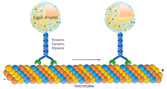 Lipid droplets are generated by the endoplasmic reticulum, the acyltransferases such as DGAT and GAPT are localized on the surface of the endoplasmic reticulum. The triacylglycerols (TAGs) and sterol esters (SEs) accumulate in the middle of the phospholipid membrane of the endoplasmic reticulum, forming a “lens” structure on the endoplasmic reticulum as lipids accumulate [4,5]. Lipid droplets are broken down in three ways: firstly, they are broken down by lipases on the surface of lipid droplets [6,7,8,9], or they release their stored lipids rapidly by contacting with mitochondria, with their neutral lipid cores shrinking and eventually being broken down [17]; secondly, lipid droplets are recognized by autophagic vesicles and then wrapped by autophagic lysosomes, and their stored neutral lipids, phospholipids, and proteins are broken down by various hydrolytic enzymes in the autophagic lysosomes [18,19,20,21,22]; moreover, lipid droplets are also broken down by associating with peroxisomes [23,24]. Throughout the life of a lipid droplet, the process from generation to breakdown requires mutual contact with other organelles, and this process is dependent on the movement of the lipid droplet. Previous studies have shown that lipid droplets attach to components of the cytoskeleton, such as microfilaments and microtubules, and move along them [25,26]. Several recent papers showed specific interactions between LDs and cytoskeletal proteins, including motor proteins such as dyneins [27,28,29] and myosins [26,30,31]. In this process, proteins are required to “bind” the lipid droplets to the microfilaments and microtubules, and, in addition, kinetic proteins and energy are required to drive the movement of lipid droplets along the microfilaments and microtubules. The analogy is that the lipid droplet is like a car, the microtubules are like the road, the kinesin is like the engine, the energy is like the gasoline, and the scaffolding protein is like the wheels. The lipid droplet can move only if each component of this system is functioning properly. This paper reviews this locomotor system and introduces the recent findings.
