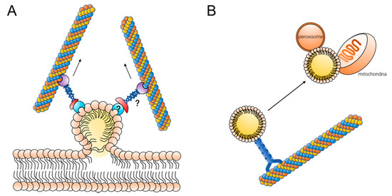 Motility contributes to lipid droplet metabolism: (A) lipid droplet moves along with microtubes, contributing to the budding process; the proteins linking lipid droplets to microtubules remain to be further elucidated, and additionally, more experimental data are still needed for microtubule proteins to target lipid droplets directly or to bind to a lipid droplet surface protein and (B) lipid droplet moves along with microtubes to contact with mitochondria or peroxisome.