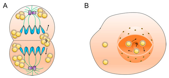 Questions in lipid droplet motility research: (A) the molecular mechanism of lipid droplet distribution during cell mitosis and (B) the motility mechanism of nuclear lipid droplets.