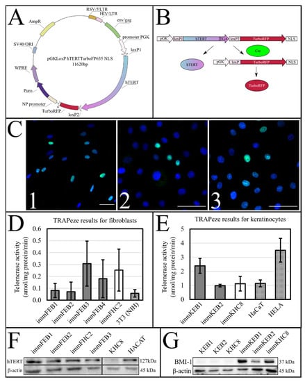 Forced expression of hTERT was applied widely to establish immortalized cell lines, particularly to expand the lifetime of dermal fibroblasts [