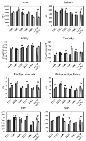 56] was used to segment the cells on the images. Holes in binary masks were filled and shapes were analyzed with a standard FiJi function “Analyse particles.” The following parameters were analyzed: area, perimeter, bounding rectangle (width, height and aspect ratio), fit ellipse (major and minor axes), circularity, roundness, solidity and caliper diameter (max and min).
