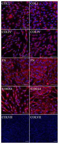 Fibroblasts were seeded into the wells of a 96-well plate (Corning, Corning, New York, NY, USA) in amounts of six thousand cells per well. The cells were cultured for seven days and then fixed with 10% buffered formaldehyde and stained with primary anti-collagen VII antibodies (ab93350, Abcam, Cambridge, UK) and secondary anti-rabbit antibodies conjugated with Alexa-594 (A21442, Invitrogen, Carlsbad, CA, USA). Nuclei were stained with DAPI (Biotium, Fremont, CA, USA). Fluorescent microphotographs of the cells were made with an EVOS FL AUTO microscope with the same channel settings for all images.