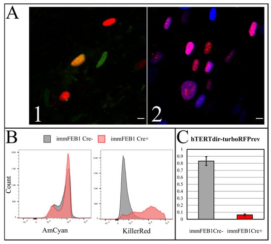 To increase the effect, several rounds of Cre transfection could be applied. We subjected immFEB1 to three rounds and immFEB4 to one round of Cre transfections. It resulted in 40% and 13% of cells demonstrating TurboFP635 fluorescence in nuclei in immFEB1 and immFEB4, correspondingly. We performed several tests to check whether splitting out the exogenous cassettes would result in restoration of some of the traits of the primary cells. We showed that after Cre transfection, immFEB cells demonstrate diminished proliferative capacity (
