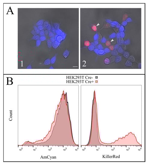 A Bio-Rad S3 Cell Sorter (Bio-Rad, Hercules, CA, USA) with a 488-nm laser was used for live cell flow cytometry. Fluorescence was detected in the green (FL1, 510–540 nm) and red (FL4, 660–690 nm) channels for the cells expressing eGFP (pCAG-Cre:GFP plasmid) or TurboFP635 (TurboFP635-N vector, Evrogen). A FACSAria cell sorter (BD, Franklin Lakes, New Jersey, NJ, USA) was used for Hoechst 33342 (B2261, Sigma-Aldrich, St. Louis, MO, USA) and TurboFP635 fluorescence detection. The analysis was performed with the AmCyan channel for Hoechst 33342 and the KillerRed channel for TurboFP635.