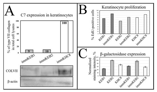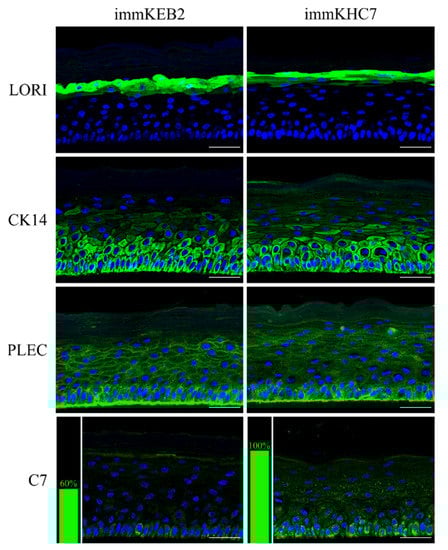 32]. Suggesting that fibroblast secretion of C7 is not abandoned while the difference in the amount of protein might not be clearly visible, the plausible difference in expression was checked by analysis of C7 in keratinocytes. The expression of C7 was shown for the immKHC skin equivalent, while the major downregulation in C7 expression was revealed for immKEB2 skin equivalents demonstrating about half of staining intensity compared to a healthy skin equivalent (