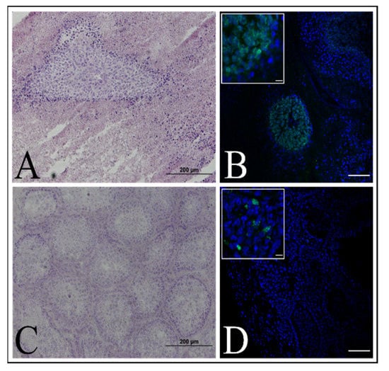 Skin equivalents or testes were fixed in 10% buffered formaldehyde (Biovitrum, Saint Petersburg, Russia) overnight, washed in PBS (PanEco, Moscow, Russia) three times for 1 h and placed in 30% sucrose (Sigma-Aldrich, St. Louis, MO, USA) on PBS overnight. The fixed tissues were embedded in Tissue-Tek O.C.T. (Sakura, Osaka, Japan) and were frozen in liquid nitrogen vapor. Tissue sections were made by criotomy. Slides with mounted sections were air-dried and then stored at −70 °C.