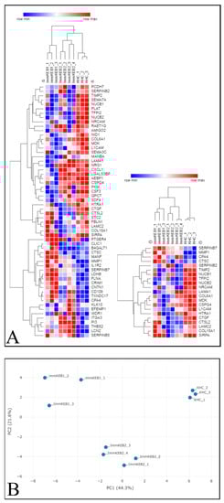 For each line, 100 thousand keratinocytes were passed in a 35-mm Petri dish and cultivated for four days in the CnT-07 medium (CELLnTEC, Bern, Switzerland). The conditioned medium was collected in tubes and centrifuged at 12,000 rcf for 10 min to precipitate the cellular debris. The supernatant was transferred to new tubes. Protein concentration was measured using the Bradford method with the Coomassie G-250 solution (Bio-Rad, Hercules, CA, USA) with the help of a Bio-Rad iMark Microplate Reader. The conditioned medium was concentrated on Amicon Ultra Spin Columns 10k (Merck, Kenilworth, NJ, USA) according to the manufacturer’s protocol. After concentrating the complete medium volume, 100 mM Tris-HCl (pH = 8) was applied to the column twice.