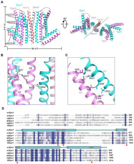 The Epo1CC2-CC4–Bem3CC1 complex is a heterologous hexamer with four Epo1CC2-CC4 molecules and a Bem3CC1 homodimer. The structure of Epo1CC2-CC4 comprises three α-helix, a CC2 helix (amino acids 821 to 851), a longer CC3 (amino acids 866 to 905) and a C-terminal CC4 (amino acids 912 to 939). Similar to Bem3CC1, two Epo1 molecules are aligned in parallel and interact directly with each other to form homodimers; the observed buried area between the two promoters is 3522 Å2. Two Epo1 homodimers located at the two sides of the Bem3 homodimer finally assemble into a heterologous hexamer (Figure 2A).