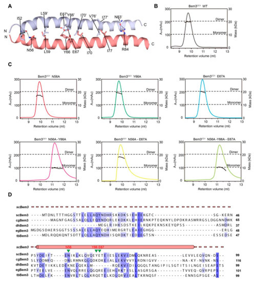 The dimer interaction of Bem3CC1. (A) The interface residues between the Bem3CC1 dimer. (B,C) The sizes of wild-type (wt) Bem3CC1 (theoretical molecular mass 11.39 kDa) and some key residue mutants were determined by MALS coupled with gel filtration. The estimated molecular masses are shown on the right axis. (D) Sequence alignment of Bem3 from different species: Saccharomyces cerevisiae (sc), Candida glabrata (cg), Debaryomyces hansenii (dh), Eremothecium gossypii (eg) and Tetrapisispora blattae (tb). The scBem3 are numbered and aligned, while the secondary structures of Bem3 are labeled on top.