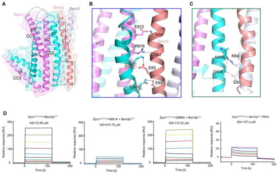 Heterologous interaction of Epo1 and Bem3. (A) Specific interaction between Epo1 and Bem3, with key regions boxed. (B,C) CC3 of two Epo1 present at the interaction surface with Bem3-CC; a stick representation of the key residue is shown. (D) The specific interaction between Bem3-CC and different Epo1-CC (WT and mutant) is characterized by SPR. Epo1-CC is seen binding to Bem3, Epo1-CC-K881A to Bem3, Epo1-CC Q88A to Bem3 and Epo1-CC R84A to Bem3.