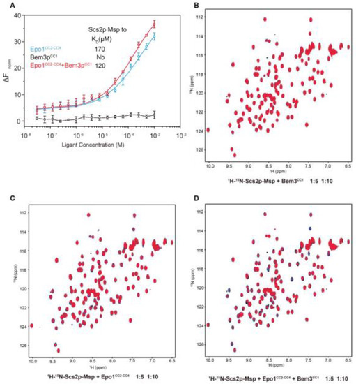 The analysis of Scs2-Msp interaction with Epo1 and Bem3. (A) 10 μL of labeled N-His Scs2-Msp (100 nM) was added to a serial dilution of Epo1 (blue), Bem3 (black) or an EB complex (red) with an initial concentration of 2 mM and applied in a buffer containing 20 mM Tris-HCl, pH 8.0, 150 mM NaCl, 4 mM MgCl2 and 0.05% Tween 20. Error bars showing SD were calculated from triplicate experiments. (B) An overlay of the 1H-15N HSQC spectra for 0.5 mM of 15N-labeled soluble Scs2p-Msp (1-128) in the absence (black) and in the presence of N-His-unlabeled Epo1CC2-CC4 at a molar ratio of 1:5 (blue) and 1:10 (red). (C) An overlay of the 1H−15N HSQC spectra for 0.5 mM of 15N-labeled soluble Scs2-Msp (1-128) in the absence (black) and in the presence of N-His-unlabeled Bem3CC1 at a molar ratio of 1:5 (blue) and 1:10 (red). (D) An overlay of the 1H−15N HSQC spectra for a 0.5 mM of 15N-labeled soluble Scs2-Msp (1128) in the absence (black) and in the presence of the Epo1CC2-CC3 + Bem3CC1 complex at a molar ratio of 1:5 (blue) and 1:10 (red).