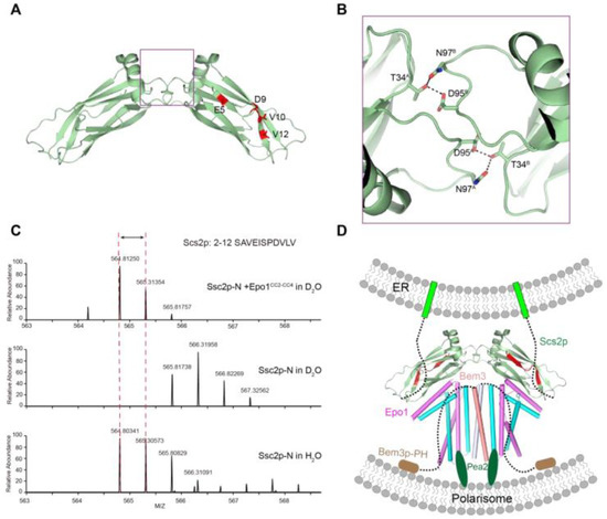 The model for the role of Epo1 and Bem3 in pulling the cER actively into the bud. (A) The interface between the Scs2 dimer; two promoters are labeled molecular A and molecular B. (B) Key regions are boxed and a stick representation of key residues is shown. (C) H/D exchange analysis of the Scs2–Epo1 complex; representative deuterium exchange mass spectra of the Scs2 peptide fragment. The peptide section of Scs2 from amino acids 2–12 is shown in red. (D) A model of the Scs2–Epo1–Bem3 polarisome complex keeping the PM-attached cER close to the tip of the bud during tip growth. Scs2 transmembrane domains are shown as green, while the Bem3 PH domain for binding the PM of polarisome is colored brown.