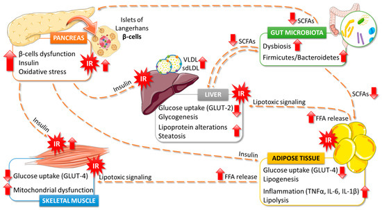 Representative scheme of the Type-2 diabetes mellitus pathophysiology. Main organs affected in T2DM and their interrelation in insulin resistance development. FFA, free fatty acids; GLUT-2, type 2 glucose transporter; GLUT-4, type 4 glucose transporter; IL-1β, interleukin 1 β; IL-6, interleukin 6; IR, insulin resistance; sdLDL, small dense low density lipoproteins; SCFAs, short-chain fatty acids; TNFα, tumor necrosis factor α; VLDL, very low density lipoproteins.