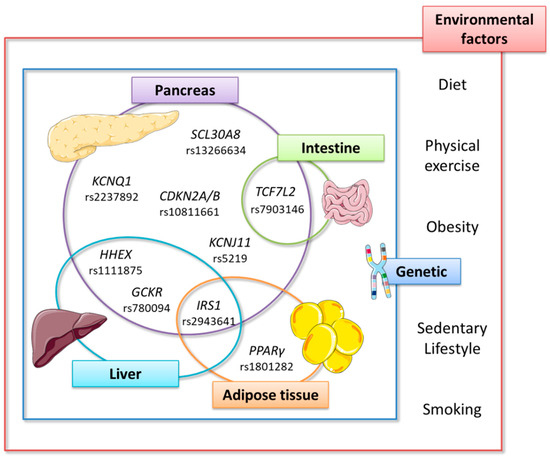 Major environmental and genetics factors related to type-2 diabetes mellitus (T2DM). The Venn diagram summarizes loci significantly associated with T2DM according to the main organ affected (p < 5 × 10−8). The genetic variants represented are widely influenced by environmental factors, where diet and physical exercise are the main ones.
