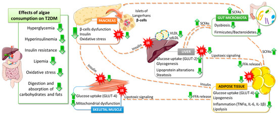 Effects of algae consumption on type 2 Diabetes Mellitus pathophysiology. Schematic representation of how algae consumption is able to modulate the different organs affected in T2DM. FFA, free fatty acids; GLUT-2, type-2 glucose transporter; GLUT-4, type 4 glucose transporter; IL-1β, interleukin 1 β; IL-6, interleukin 6; IR, insulin resistance; sdLDL, small dense low density lipoproteins; SCFAs, short-chain fatty acids; TNFα, tumor necrosis factor α; VLDL, very low density lipoproteins.